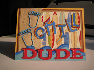 I found the cutest foot paper clips at Walmart and knew they would be just darling on a card. The first thing I thought of was sort of a "hang 10" sort of thing, especially when I saw the sand and surfboard paper in the DCWV Summer glitter stack. I thought this would make a great birthday card for a teenage boy. Chill is cut from All Mixed Up and Dude from Plantin Schoolbook using the roly poly feature. The waves are from Zoobaloo. It's your day is from Celebrations and the exclamation point is hand cut from the card stock.