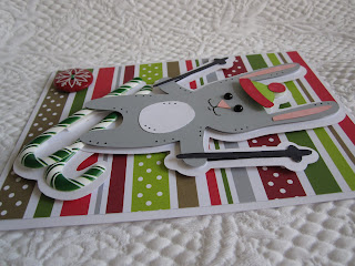 I know, this isn't the kind of Cricut card I usually make, but this week's Bah! Humbug! challenge is Candy Canes, and I had these cute plastic ones from JoLee's that I kept thinkin' looked like skis, so there ya go. I mean how could I NOT use the skiing bunny from Winter Frolic? I had to do a pieced shadow because the candy cane skis were alot longer than the Cricut ones, and usually I'm not a real fan of the characters on Winter Frolic, but the bold striped DP and simplistic design sort of make me think of anime.