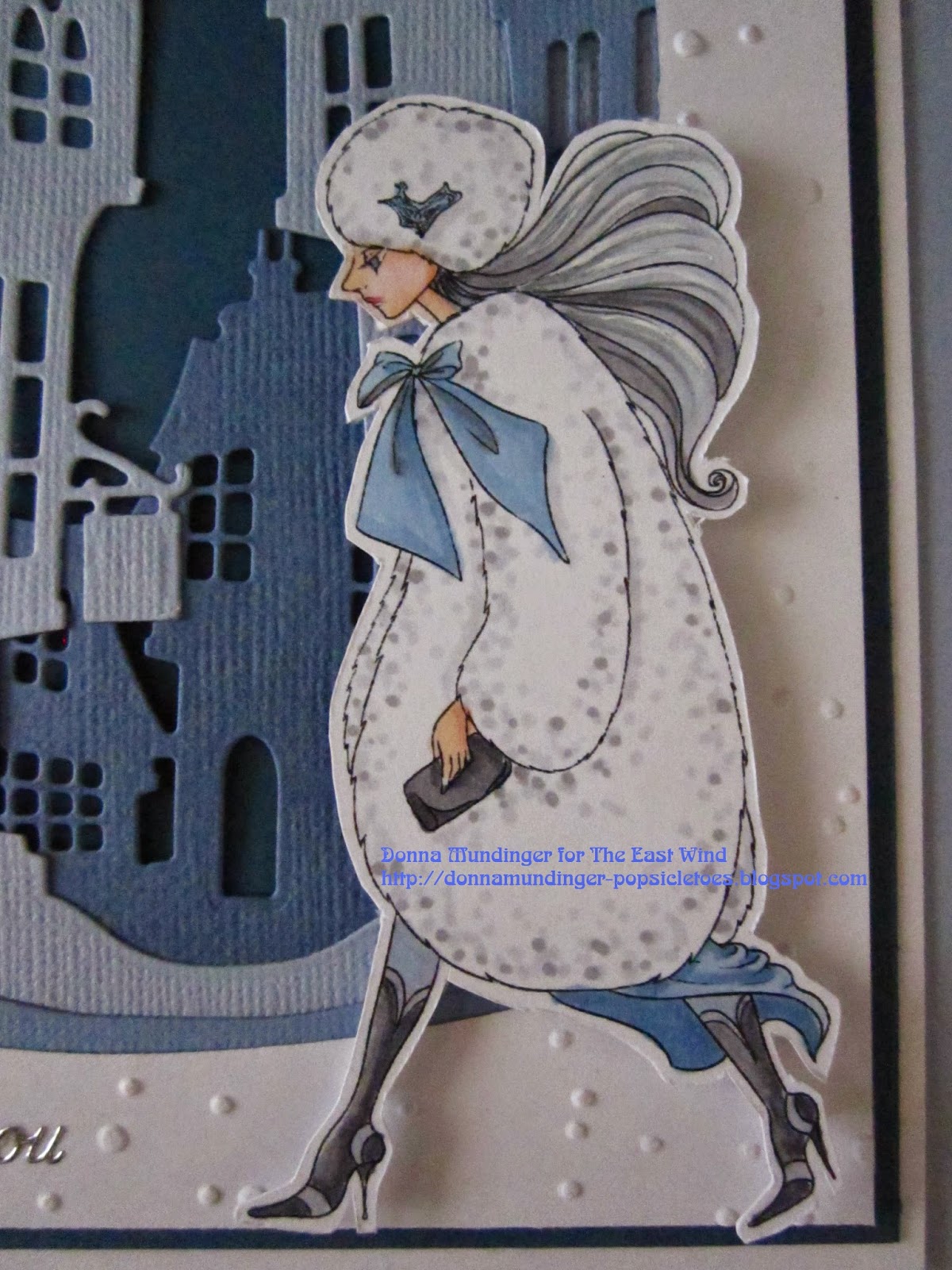 It's time for a new challenge at The East Wind and this time the theme is "Baby, it's Cold Outside". Pretty fitting, considering the cold wave that's sweeping the country (but not here in CA, it's been in the 70's. Yeah, I know, we're sooo spoiled). I had a hard time choosing an image for this one because there are so many fabulous ones appropriate for this theme at The East Wind Etsy Shop, but my new XCut Build a Scene die was just itching to be used and I thought the gorgeous Lucy Loo 'Cat Walk' was the perfect choice. I embossed the top layer with the Cuttlebug limited edition snowfall folder to add some softness to the cold frosty scene. The sentiment is a Starform peel off sticker in silver metallic to match the silvery moon. Lucy looks like she's missing someone, don't you think? It's so hard to be away from the ones you love at Christmas.
