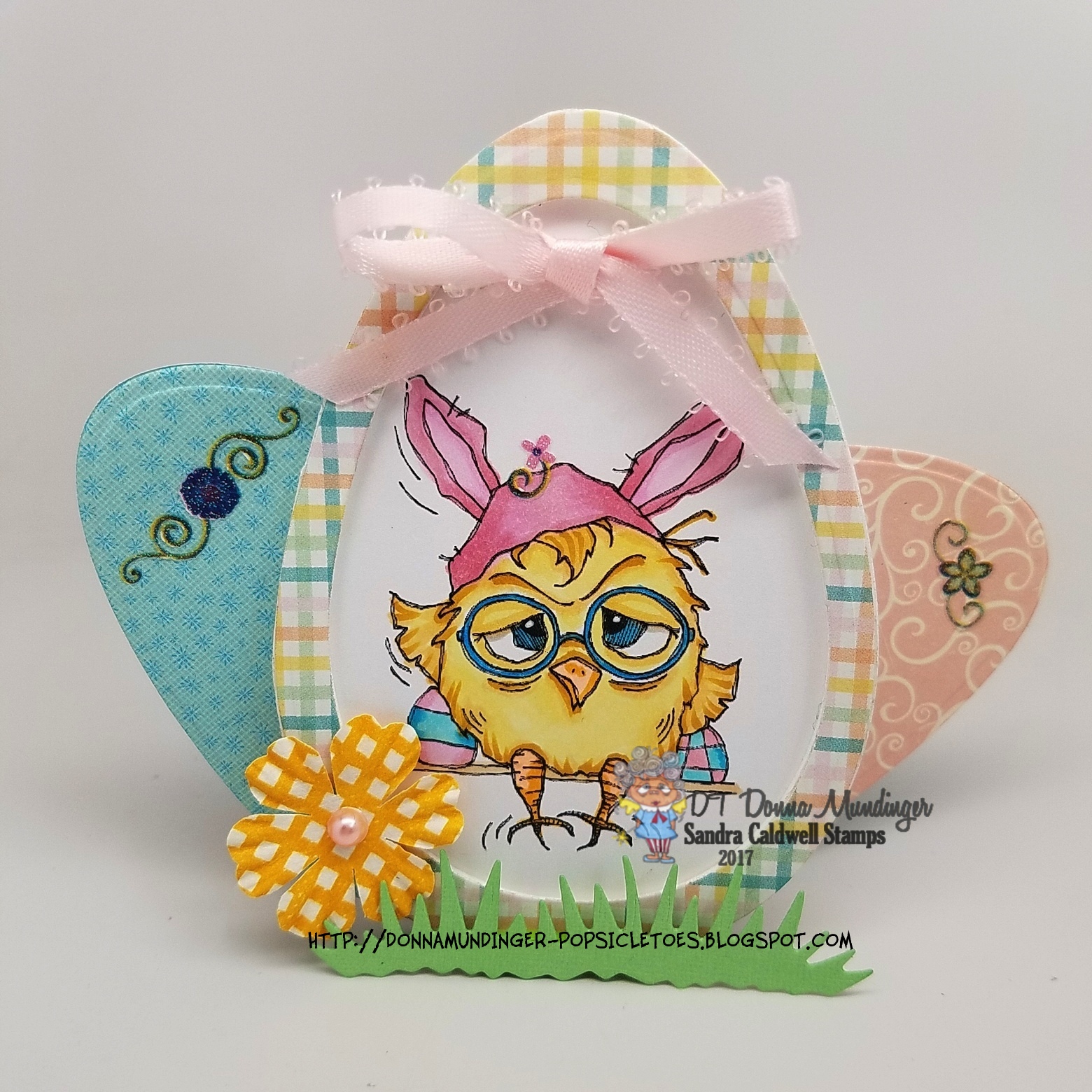 I'm loving all the cute Easter Stamps by Sandra Caldwell and decided to use #504 Bunny Chick to enter in two of the Outlawz challenges this week. I'm just under the wire for the Tuesday Color challenge and then thought, since I've got a busy week, I'd make it fit the Twisted Thursday challenge using the twist "Eggstatic Ovals". My shaped card was done with Spellbinders Nested Eggs with some grass from Gina Marie. Bunny Chick was colored with Copics and I've added a tiny rub on to his bunny ears and also to the eggs on either side. The flower, ribbon and pearl center are from my stash.